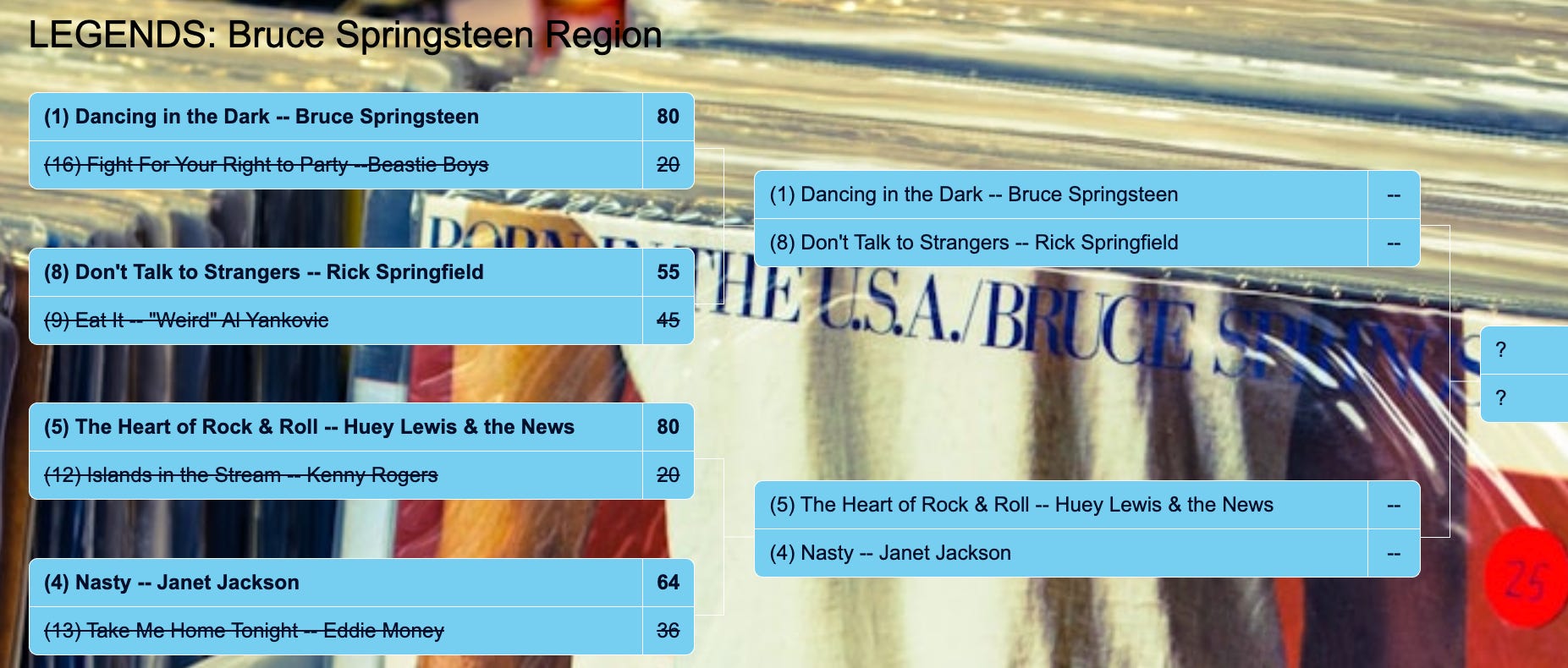 We start off the Bruce Region second round with two matchups consisting of four songs that did their jobs and won as favorites: 1,4,5, and 8. There were no upsets in the top of the bracket, though Weird Al came closest.